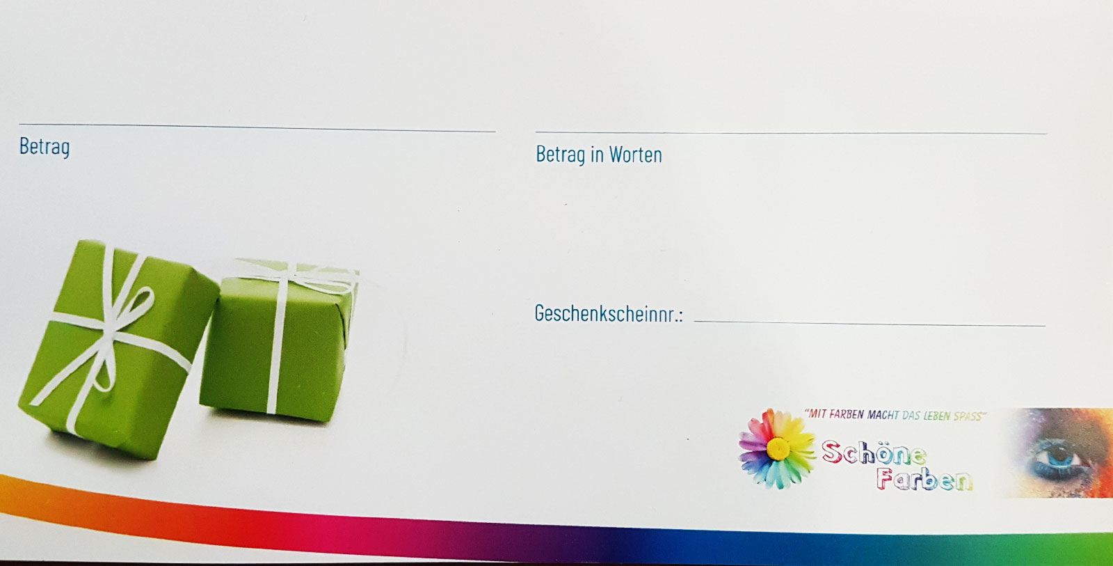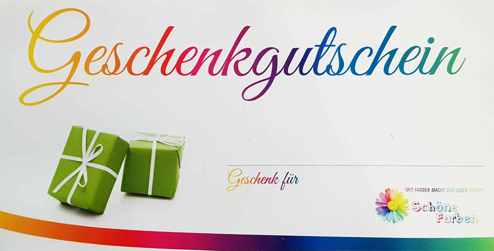 Möchten Sie Ihren Partner oder Ihre Familie mit einem besonderen Geschenk überraschen? Dann ist der Gutschein von Schöne Farben sicher die richtige Wohl. Der Betrag kann dabei selbst gewählt werden.